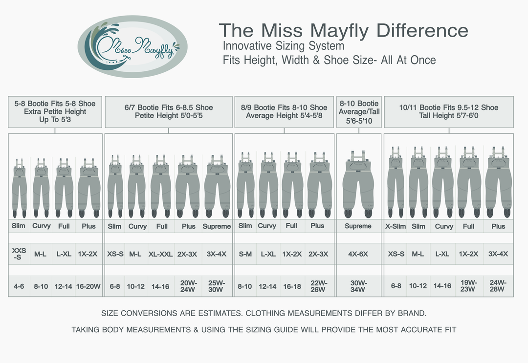 You should choose booties that fit your feet. Likewise, you should choose wading boots that fit your feet. Although varied brands have different wading boot sizing standards, Miss Mayfly has removed this confusion and created our booties and wading boots to fit in line with standard women's US shoe sizes. Please see wading boot FAQ or our wading boot blog for more information.